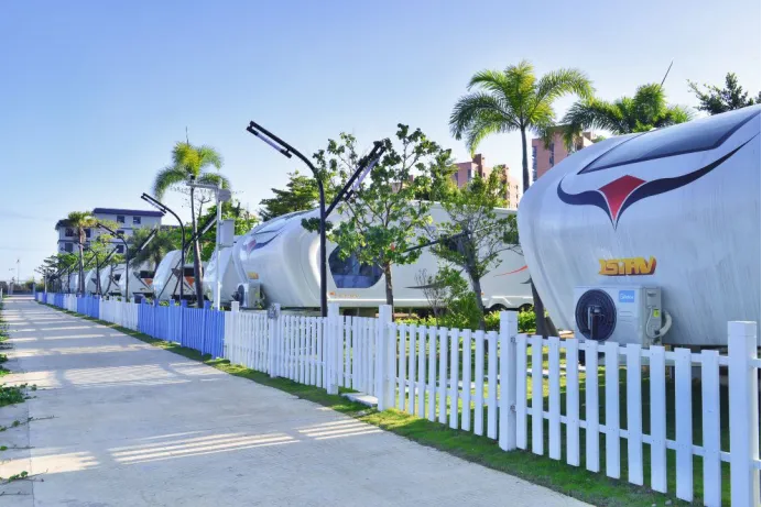 营地提供海边房车住宿,有大型草地、篮球场,步行10米即可下海。可提供多种海滩活动,如游泳、快艇、单车、团队拓展、沙滩排球、足球、拔河比赛、KTV等。营地还提供bbq和火锅炊具设备。环境整洁舒适,适合个人或团体休闲度假。
